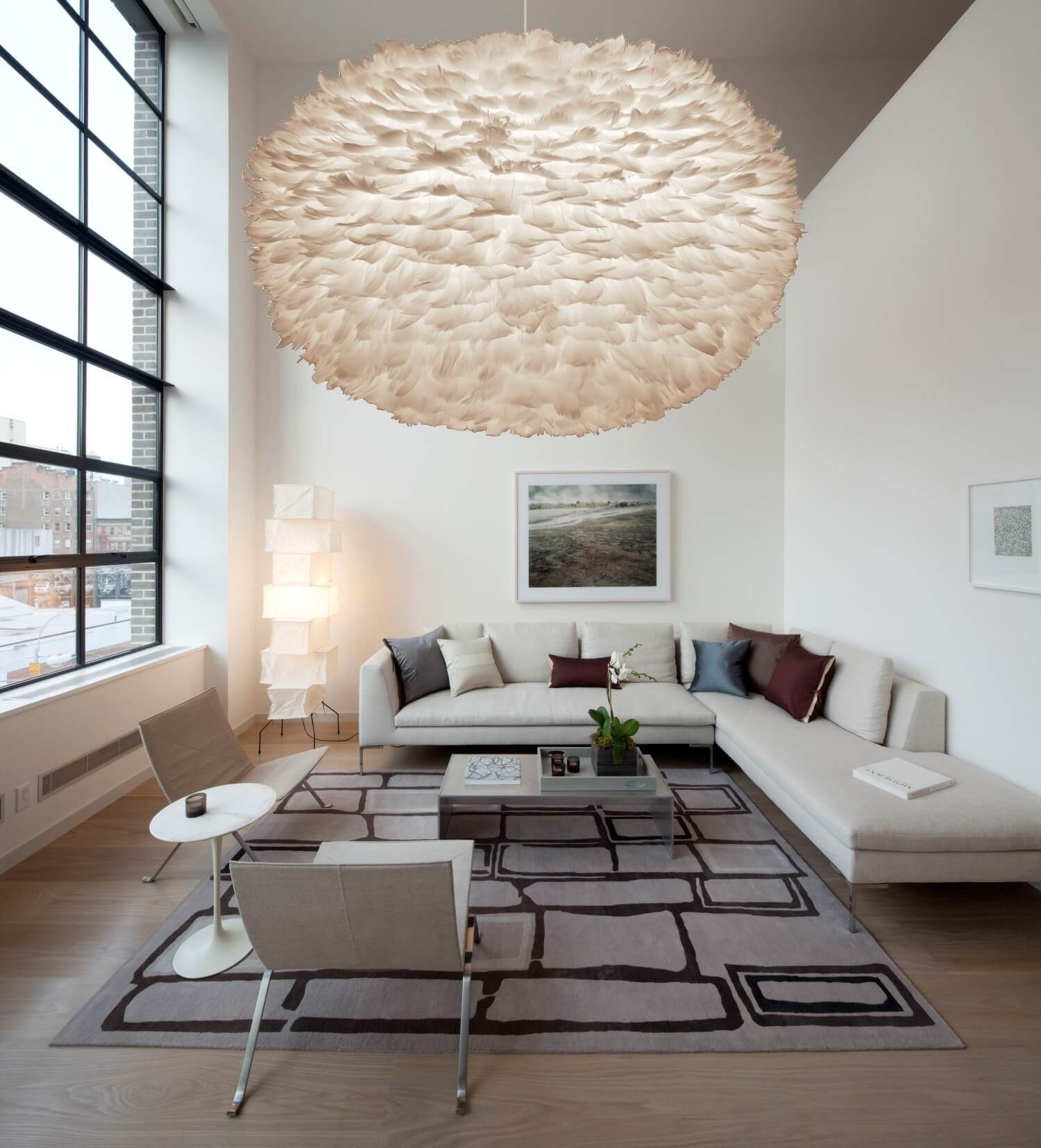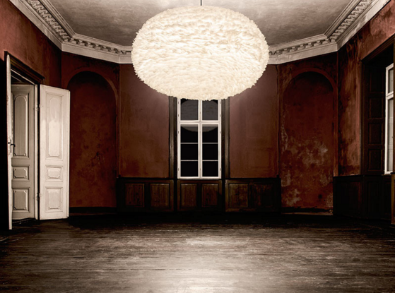 Colgante decorativo E27 30W, construida en papel, acero y plumas, con cable textil blanco. Incluye lámpara fluorescente decoglobo 18W/827.Medidas: Ø 750 x h 450 x H 2000 mm