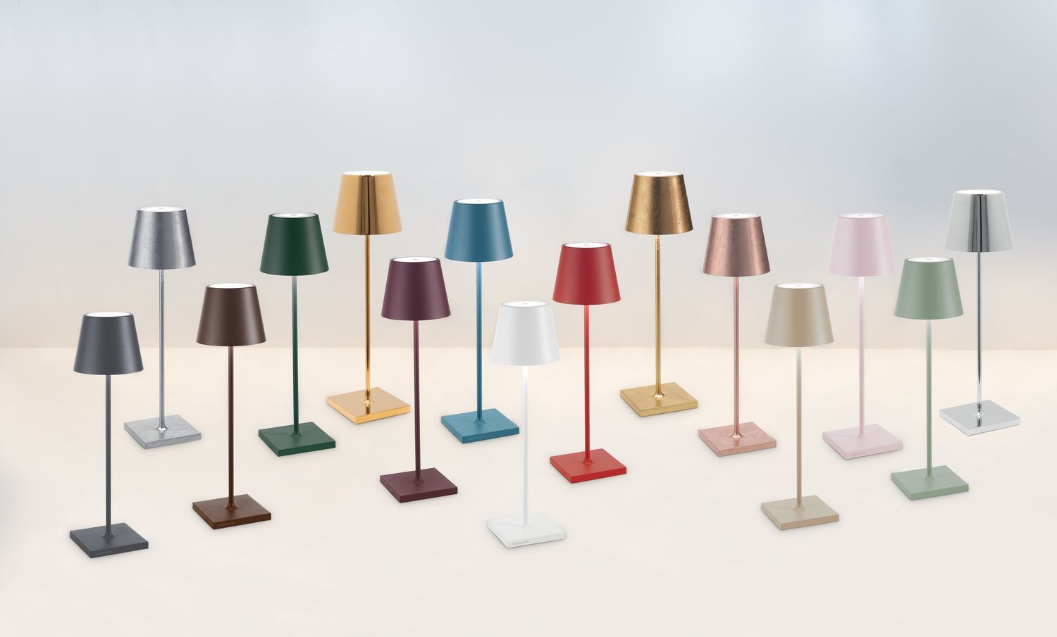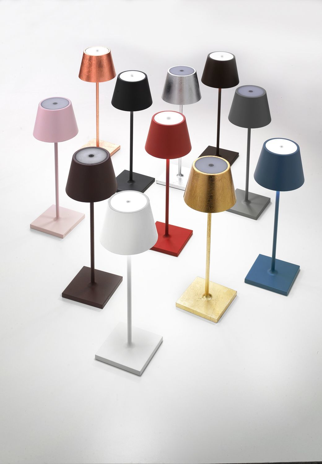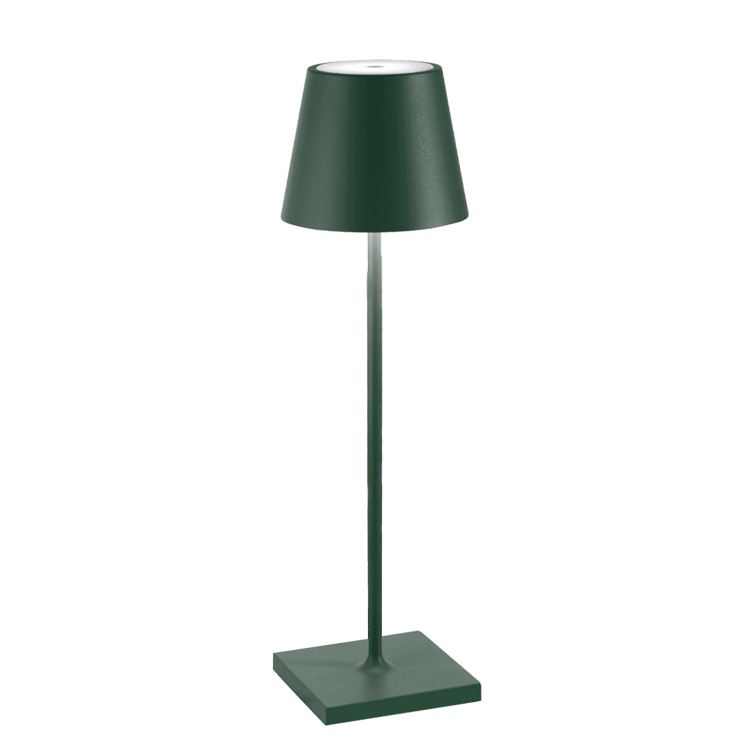 Lámpara de mesa recargable para uso exterior / interior, LED 2,2W, blanco cálido, 2200K-3000K, construída en aluminio color verde oscuro (RAL 6005), difusor en policarbonato opal. Incluye switch dimm, batería, base de carga 5Vdc max 1A (IP20) y cargador.